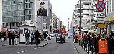 Few traces of the wall remain but the site is home to a replica of a hut housing US border guards behind sandbags as well as a “You Are Entering the American Sector” sign.